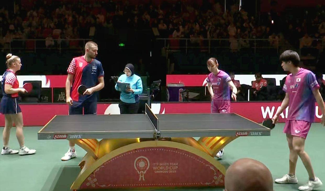 由于混团世界杯采用特殊的“先得8局胜”赛制,日本队只需要再赢一局就能结束比赛。 第四盘女双,张本美和再次登场,搭档大藤沙月迎战克罗地亚的叶格和拉科瓦奇。